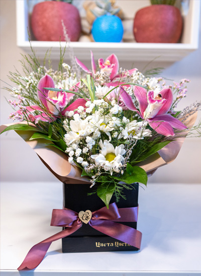 Elegantna crna kutija sa ljubičastom satenskom mašnom sadrži raskošne roze orhideje, bele margarete, gipsofilu, roze limonium i zelenilo – savršen izbor za posebne prilike i nežne emocije.