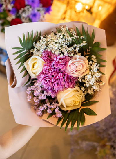 Pastelne nijanse žute i roze ruže savršeno se stapaju sa nežnim lila hrizantemama i gipsofilom, stvarajući skladnu i nežnu kompoziciju. Ovaj buket je idealan poklon za rođendane, godišnjice, majčin dan ili kao pažnja dragoj osobi.