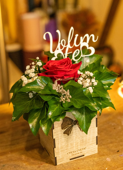 Količina cvetova: Crvena ruža, gipsofila, dekorativno zelenilo, drvena kutija sa natpisom “Cveta Cvetić” i drvenim dodatkom “Volim te”.