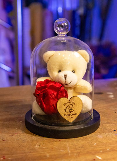 Količina cvetova: Plišani beli meda, stabilizovana crvena ruža, stakleno zvono sa crnom bazom i drvenim srcem sa logotipom “Cveta Cvetić”.