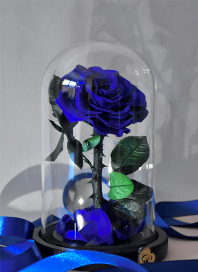 Plava večna ruža u staklenom zvonu predstavlja retkost, duboku emociju i otmenost. Simbolizuje jedinstvenu i nezaboravnu ljubav, kao i spokoj i poverenje. Idealan je poklon za voljenu osobu, prijatelja ili nekoga ko zaslužuje nešto posebno i vanvremensko.
