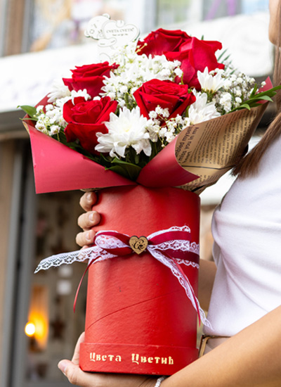 Buket u crvenoj kutiji sa crvenim ružama, belim hrizantemama i gipsofilom – savršena kombinacija strasti i nežnosti. Dekorisan vintage papirom i čipkastom mašnom sa drvenim srcem, ovaj aranžman ostavlja snažan utisak.